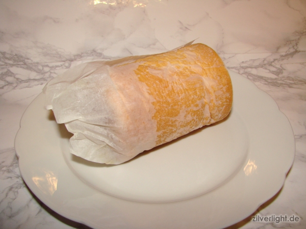 Wenn das Brot noch in dem Papier eingewickelt ist,sieht es ziemlich matschig aus.-.-