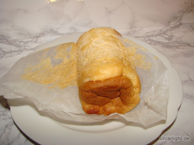 Persönlich finde ich es eigentlich vom Aussehen her nicht sonderlich schlimm, sieht halt aus wie ein Hefezopf ohne goldgebräunte Oberfläche und genau so schmeckts im Prinzip auch.
