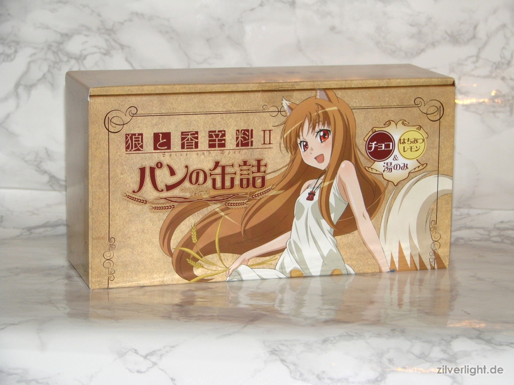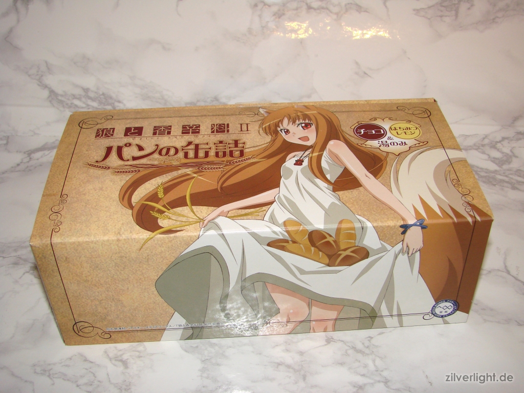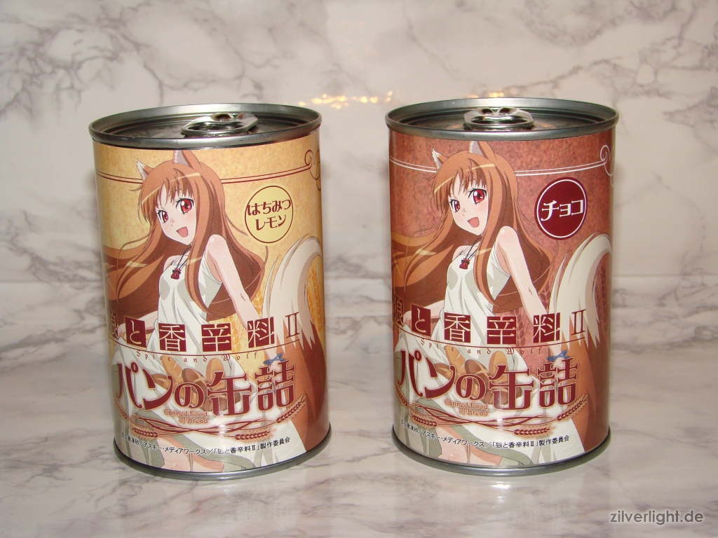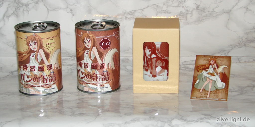 Jeder kennt Dosensuppen, Dosenwurst und was es sonst noch so alles gibt. Exakt das selbe ist hier in Brotform enthalten, somit Dosenbrot. In Japan gibt es diese Art von Anime spezifischen Dosenbroten gerne mal als spezielle Kampagne, wie z.B. damals als es eine ganze Reihe an Dosenbroten zur Serie CLANNAD gab. Diese waren jedoch nur über Automaten in Akihabara zu erwerben. Ähnlich verhält es sich mit diesem Set von Spice and Wolf.