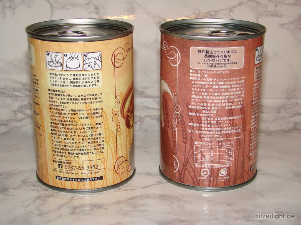Die beiden Brotdosen tragen auf dem Etikett dasselbe Motiv wie die Verpackung und sind farblich auf ihre Geschmacksrichtungen abgestimmt. Auf diese Weise dürfte selbst jedem der kein japanisch versteht klar sein wo denn nun welche Sorte zu finden ist. Die Brotdosen wurden im Übrigen von Hersteller Pan Akimoto produziert, welcher natürlich hauptgeschäftlich im Dosenbrotgeschäft tätig ist. ^^