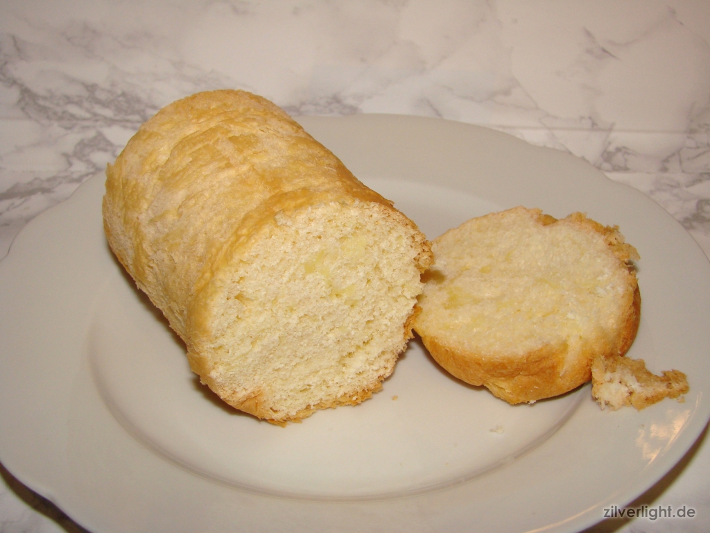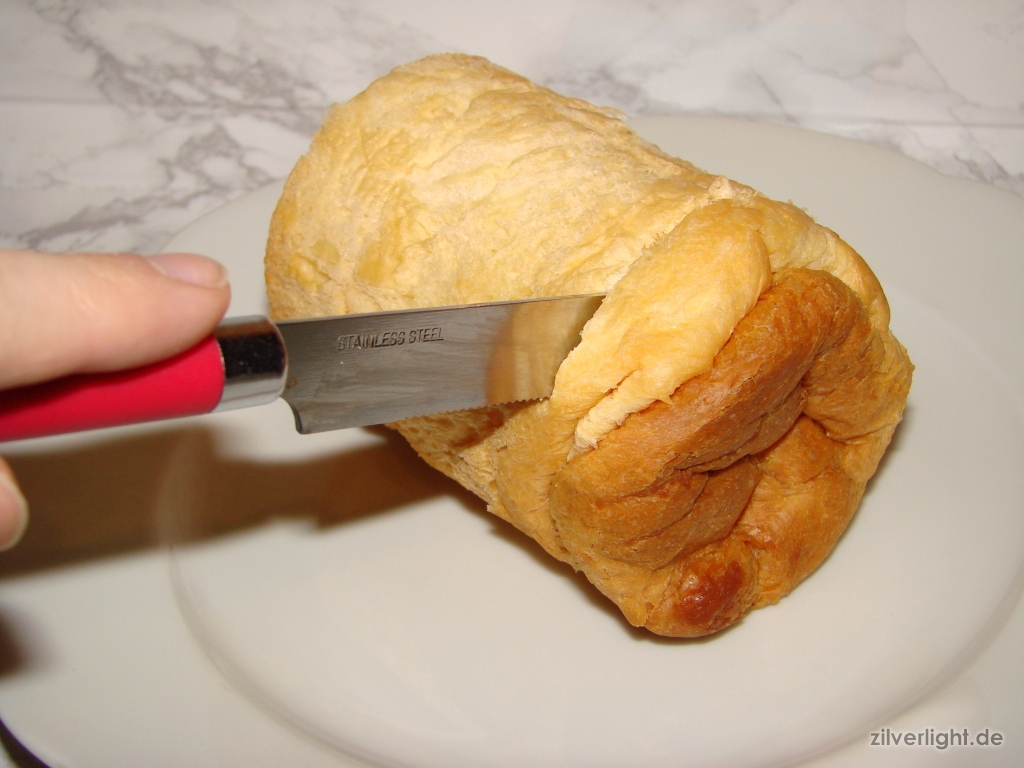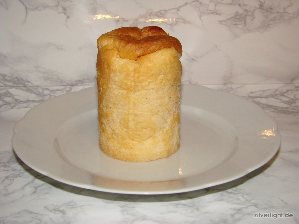 Persönlich finde ich es eigentlich vom Aussehen her nicht sonderlich schlimm, sieht halt aus wie ein Hefezopf ohne goldgebräunte Oberfläche und genau so schmeckts im Prinzip auch.