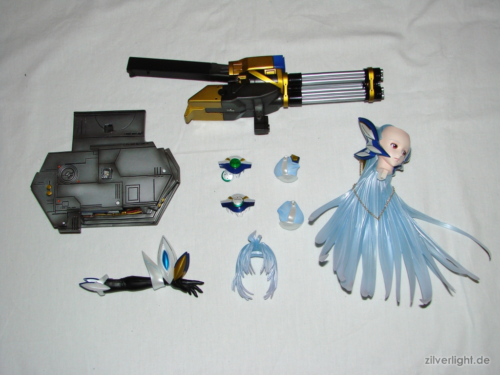 Die Einzelteile in der Übersicht. KOS-MOS ist zum größten Teil bereits fertig zusammengebaut und es bedarf nur weniger weiterer Teile um sie vollkommen zusammenzusetzen. Eine Anleitung wird hierfür nicht mitgeliefert, aber soweit sollte sich das Ganze von selbst erklären. Probleme beim Aufbau gab es bei mir zumindest nicht.
