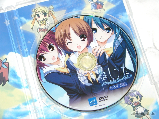 Die DVD selbst ist wieder picture-labeled und zeigt drei der insgesamt acht Heroines. Hoshiuta gehört einmal wieder zu den Titeln die mich aufgrund des “eingelegten DVD” Zwangs, heißt die DVD muss eingelegt sein um gewisse Dinge im Spielmenü ansteuern zu können, mal wieder zum NoDVD-Patch greifen lassen.