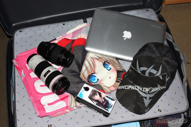 Hier mal das bisschen an Arsenal das ich mit mir nehme. Fotoausrüstung, check. Laptop, check. Loli Handtuch, check. Zeon Kappe, check. Unterhaltungskram auf dem Laptop installiert/kopiert, check. NDSi, check.
