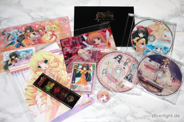 Ein Überblick sämtlicher Inhalte der Limited Edition. Insgesamt 10 Extras lagen der Limited Edition bei, welche man somit Shop-unabhängig überall mitgeliefert bekam. Das kleine Artbook, welches ebenfalls Bestandteil der Limited Edition ist, ist hier jedoch nicht in der Gesamtansicht mit aufgeführt. Die Lycèe Trading Cards sind im Übrigen nicht in die Kalkulation von 10 Extras miteingerechnet, sondern gelten als zusätzlicher Bonus.