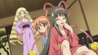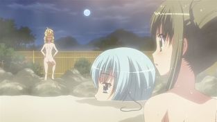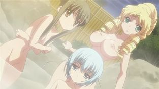 Und was ist eines der typischsten Fanservice Settings? Genau, eine Onsen Folge mit den Hauptcharakteren. Eine kurze Vorstellung, unser selbstbewusster Blondschopf nennt sich Marietta, Yuri mit den hellblauen Haaren ist Raikas Dienstmädchen und das bishoujo neben Yuri stellt die gute Freundin von Raika, Ibuki, dar.