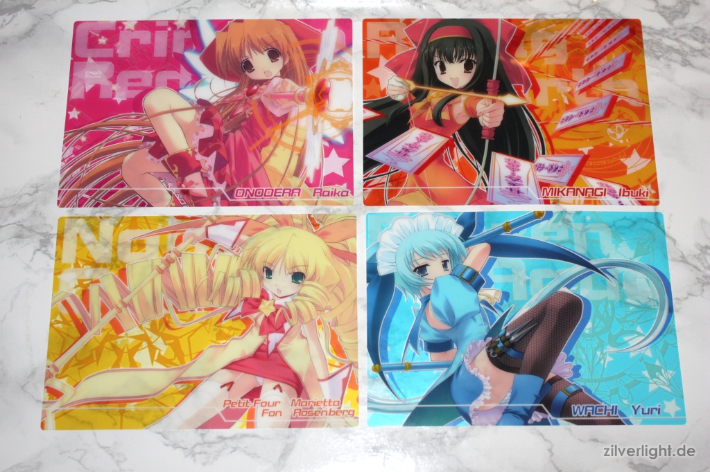 Insgesamt 7 kleine Shitajiki mit den Hauptshoujos des Visual Novels. Alle wirklich sehr schick, allerdings die vier Mahou Shoujos ganz klar in der Favoritenrolle.