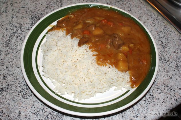 Jetzt ist alles recht simpel. Reis auf den Teller, Beutel mit dem Curry aufschneiden und über den Reis geben. Et voilà, wunderbares NanoCurry mit dem besten von der Loli. Itadakimasu!