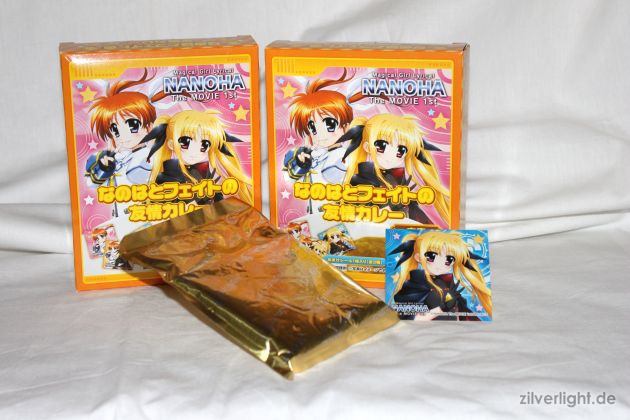 Eine Packung NanoCurry enthält zwei Beutel, welche einer Portion entsprechen, und einen von drei schönen Stickern mit Nanoha und Fate. Legen wir also los und machen uns feines NanoCurry!
