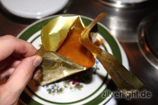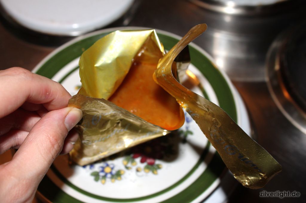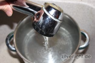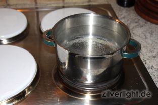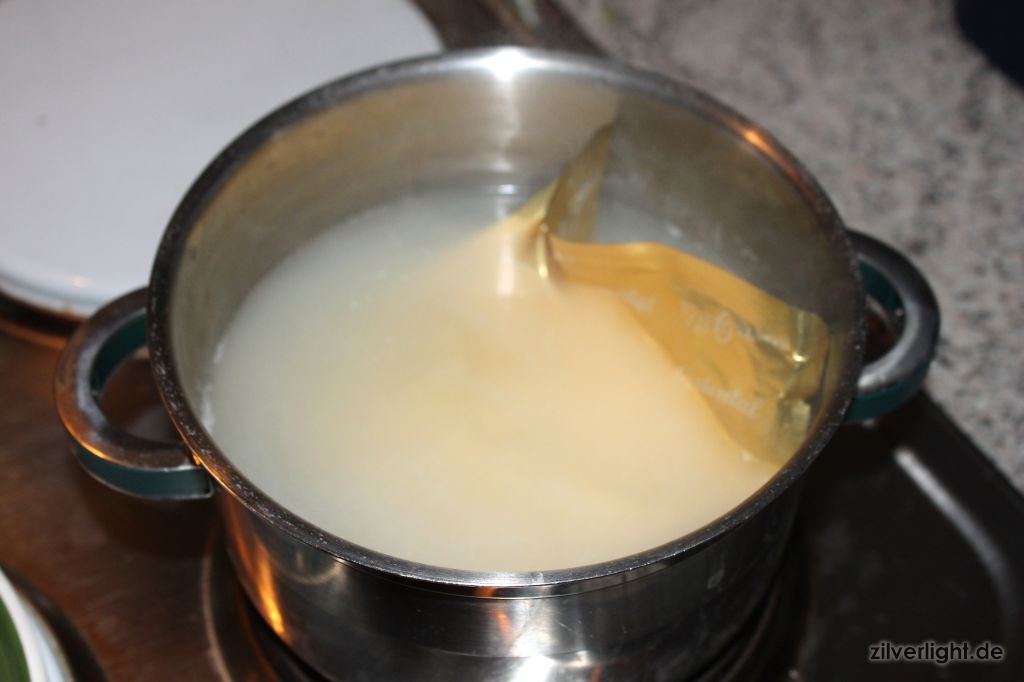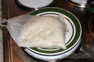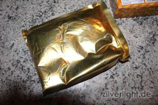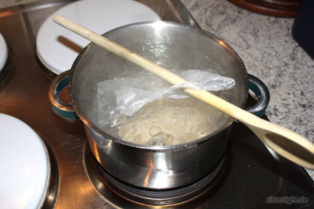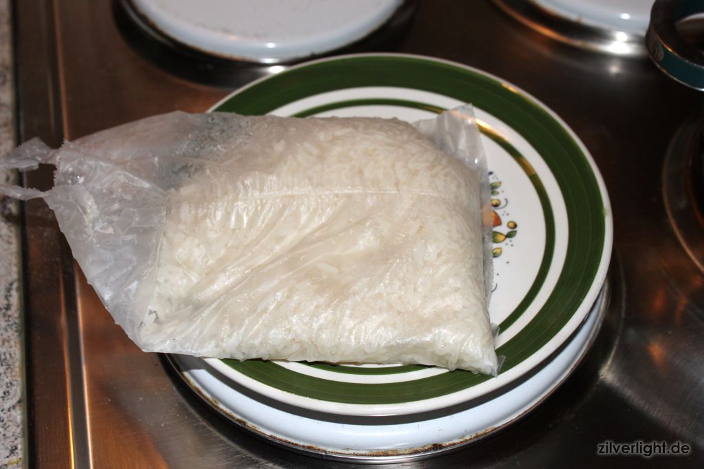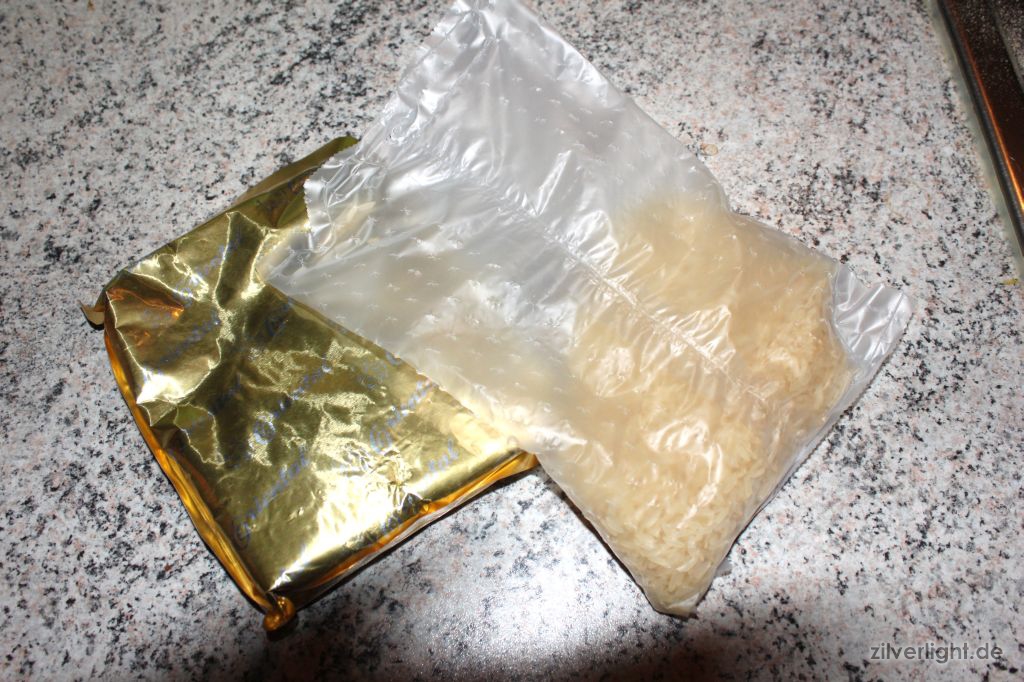 Wie bereits gesagt, handelt es sich bei dem Curry um eine Variante für den modernen Fan, welcher von Fast- und Convenience-Food lebt. Wir holen also unser Päckchen Curry aus der Verpackung und erhitzen es im Beutel im Kochtopf mit Wasser. Wundert euch nicht über das getrübte Wasser, da ich den Topf vom Reis einfach direkt weiterverwendet habe. Ganz einfache Küche ist für alle Mikrowellenbesitzer möglich, einfach den Currybeutel bei 500W (2min) oder 600W (1:30min) in die Mikrowelle und fertig. Der Zilver ist jedoch kein Fan dieser Kästen und kocht daher fein auf dem Herd.