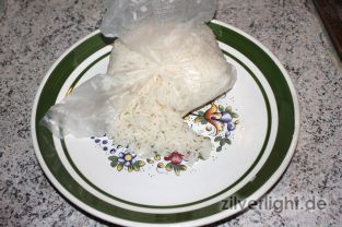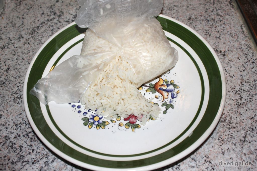 Hierzu nehmen wir erst einmal einen Topf Wasser und erhitzen diesen bis das Wasser kocht. Sobald das Wasser kocht geben wir unseren Reis hinzu. Dies ist nun jedem selbst überlassen, in meinem Fall habe ich ein vorportioniertes Tütchen mit Reis genommen. Ein Tütchen reicht für eine Portion Curry wunderbar aus.