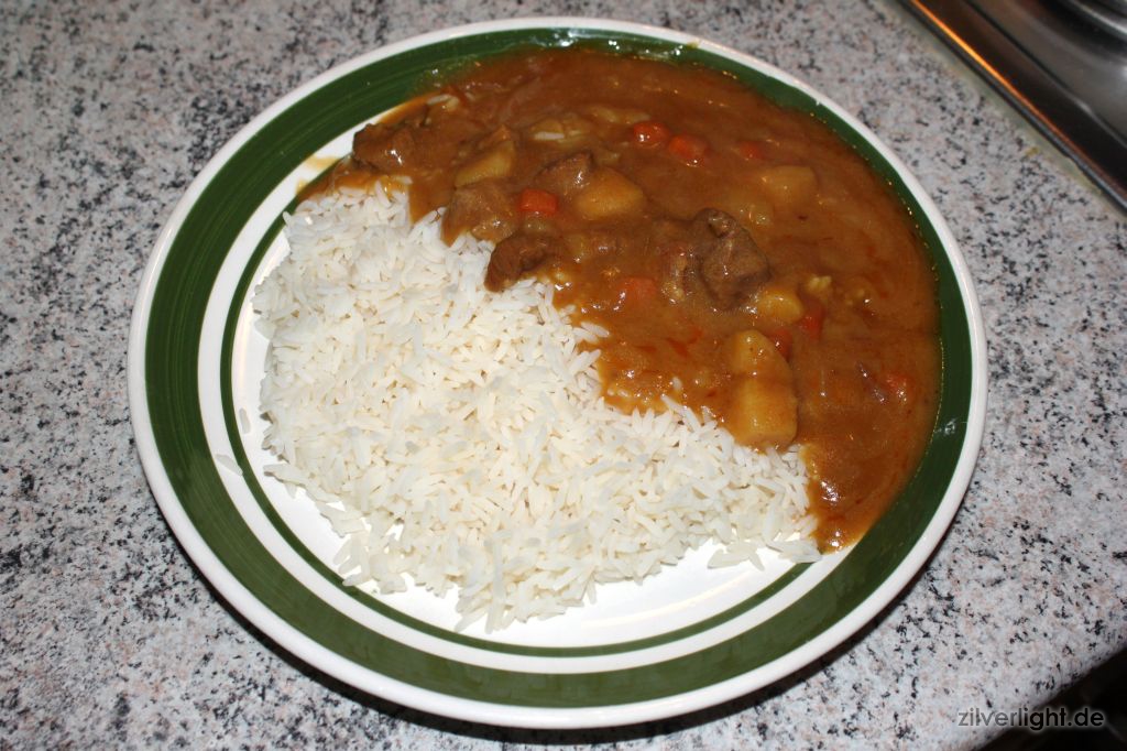 Jetzt ist alles recht simpel. Reis auf den Teller, Beutel mit dem Curry aufschneiden und über den Reis geben. Et voilà, wunderbares NanoCurry mit dem besten von der Loli. Itadakimasu!
