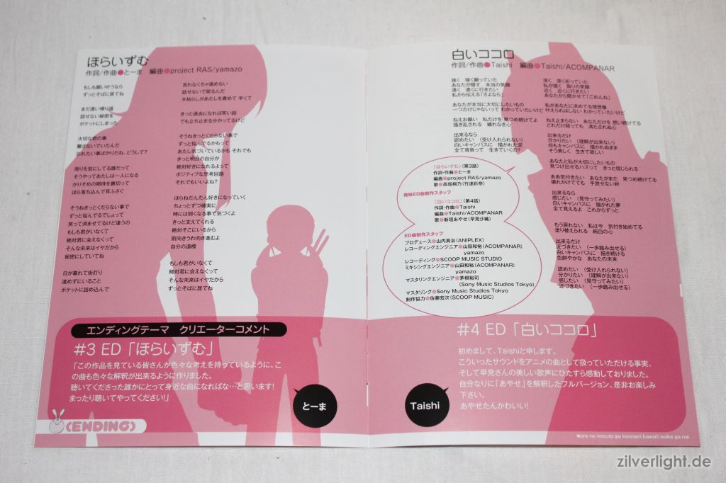 Volume 3 enthält in der limitierten Ausgabe neben der BD, eine Zusatz CD-Rom mit Webradio Aufzeichnung und zwei beidseitig bedruckte Illustration Cards. Dabei zeigt eine der Illustration Cards die Loli Ausgaben von Lala und Run, hach, das Loli Kapitel ist eines meiner Lieblingskapitel der Volume 3. ^^