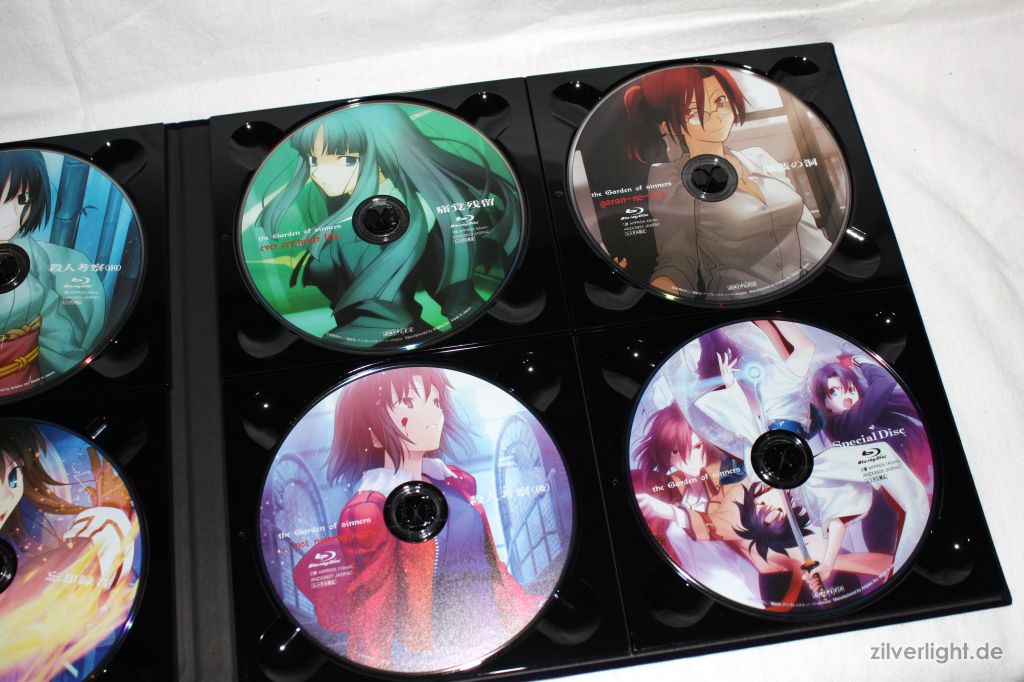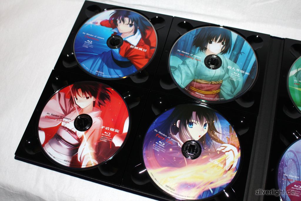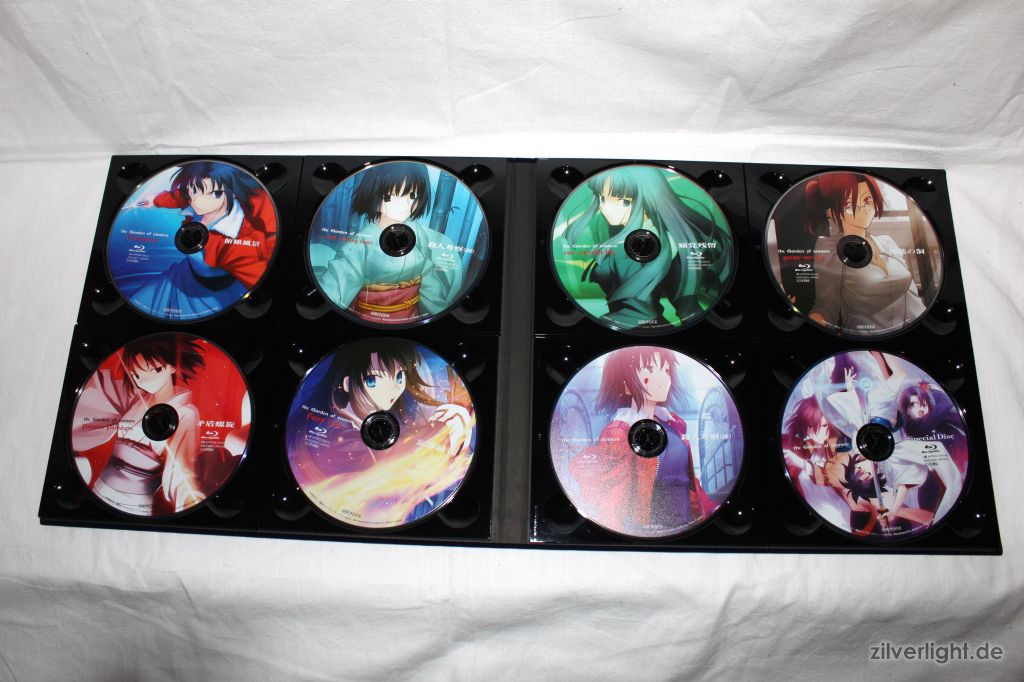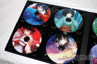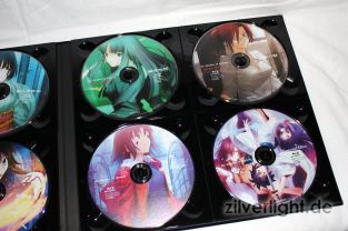 Die acht Blu-ray Discs aller sieben Filme, zusätzlich dem Epilog. Mein persönlicher Favorit unter den Filmen stellt der fünfte Film “Mujun Rasen” dar, welcher mich im Vergleich zu den anderen Filmen einen Tick besser unterhalten konnte. Die Special Disc mit dem Epilog enthält zugleich auch Kara no Kyoukai Remix -Gate of seventh heaven-, eine Zusammenfassung der ersten sechs Filme, und ein TV Special, welches damals zur Promotion des siebten Filmes gezeigt wurde.