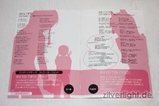 Inhalt des kleinen Booklet, dass der zweiten BD beilag. Wirklich knuddelige Illustrationen der kleinen Schwester, wenn man die Bilder so ansieht, dann könnte man doch fast meinen sie wäre ein niedliches und wohlerzogenes Schwesterchen. Naja, ein niedliches, nicht auf den Mund gefallenes imouto mit imouto-Komplex und Konsumgeilheit ist doch auch was feines. ^^”
