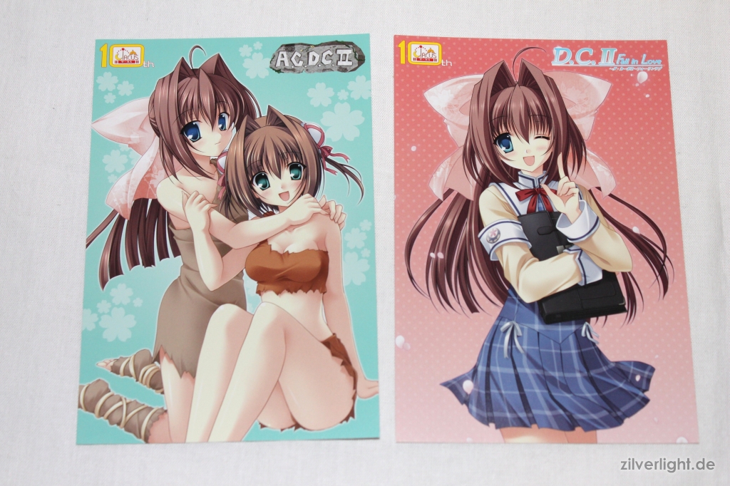 Insgesamt gibt es vier verschiedene Postkarten zum Sammeln und glücklicherweise habe ich mit dem Kauf von drei Packungen alle zusammen bekommen. Allerdings wenn ich die D.C.II bishoujo wieder so in ihren steinzeitlichen Outfits sehe, dann werde ich nur wieder daran erinnert, dass wir dringend ein A.C.D.C.II Eroge benötigen. Komm schon CIRCUS, D.C. und D.C.II wurden noch nicht genug gemelkt! Der Zilver braucht mehr davon. ^^