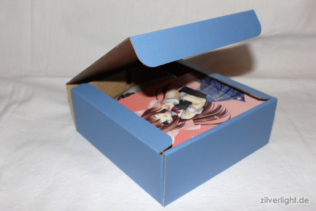 Aus dem Verpackungspapier befreit, enthüllt sich eine komplett blau gehaltene Pappschachtel, welche den Inhalt beherrbergt.